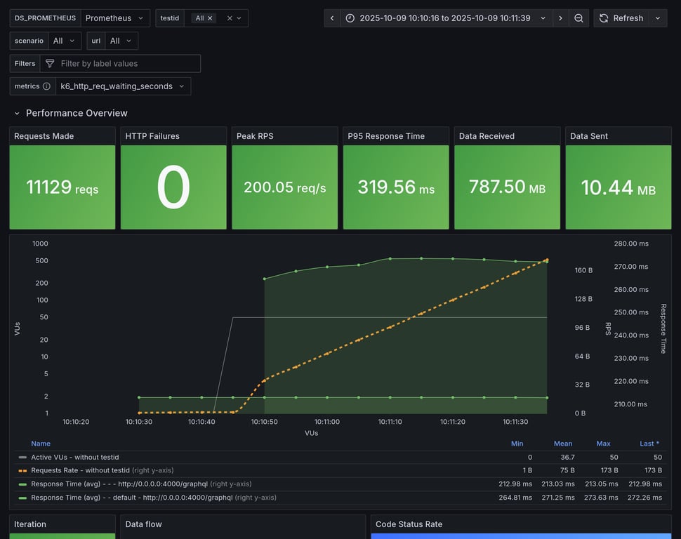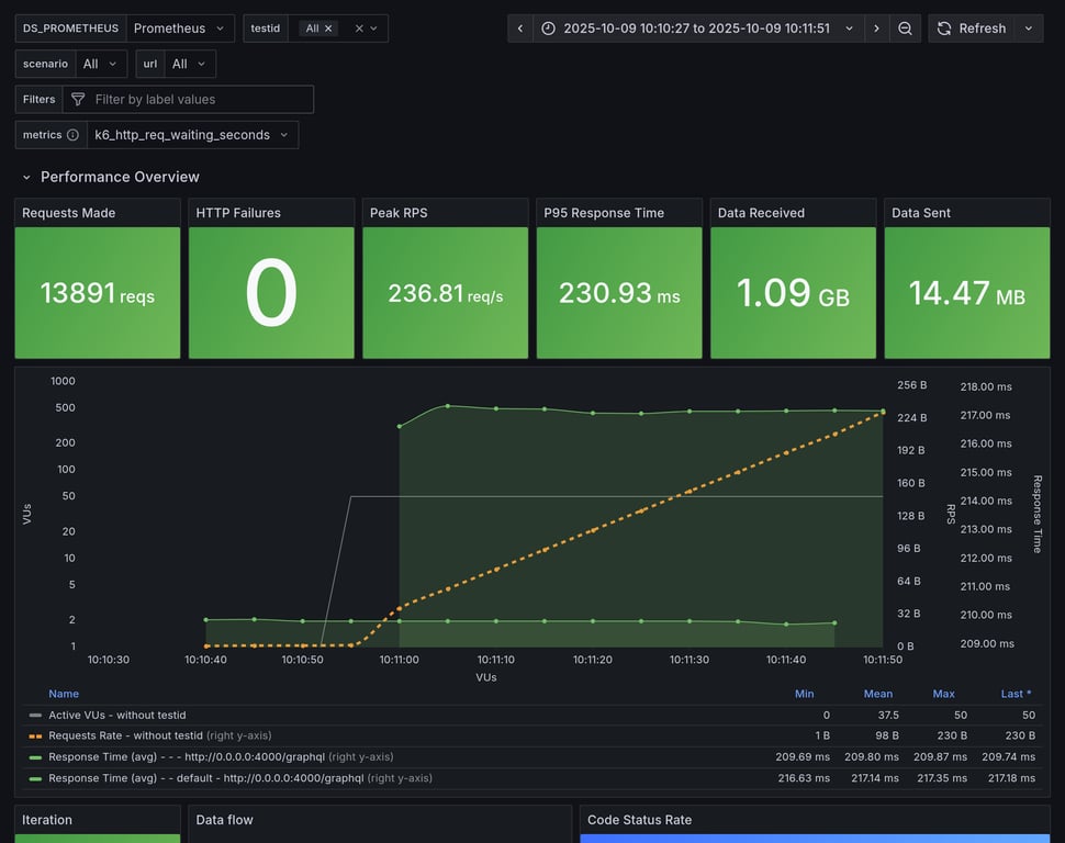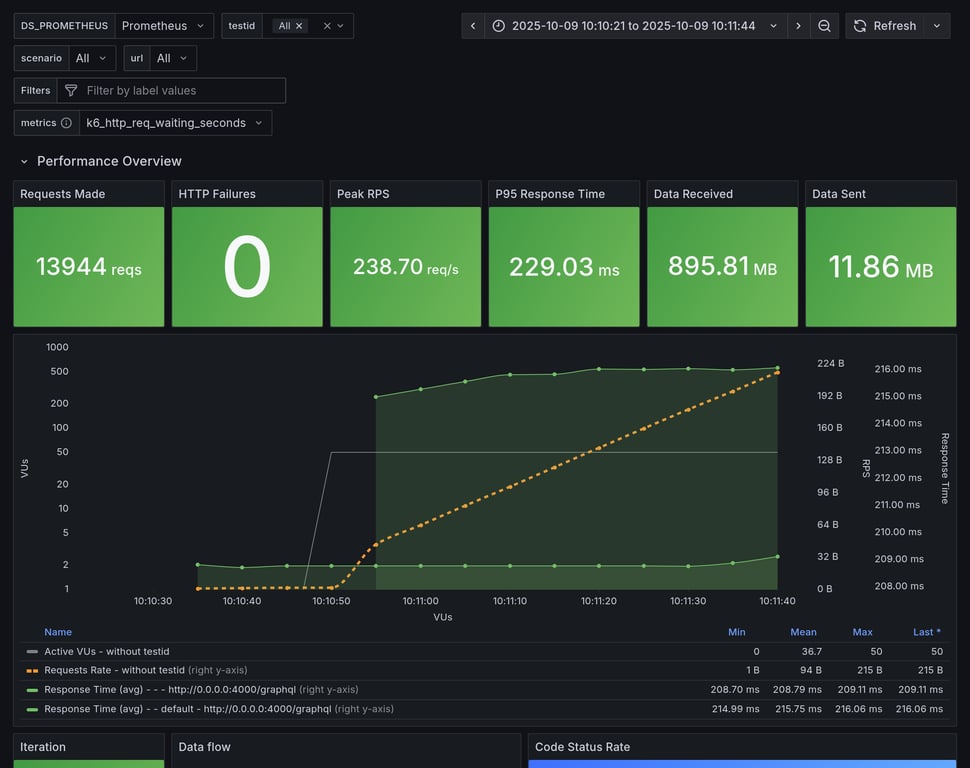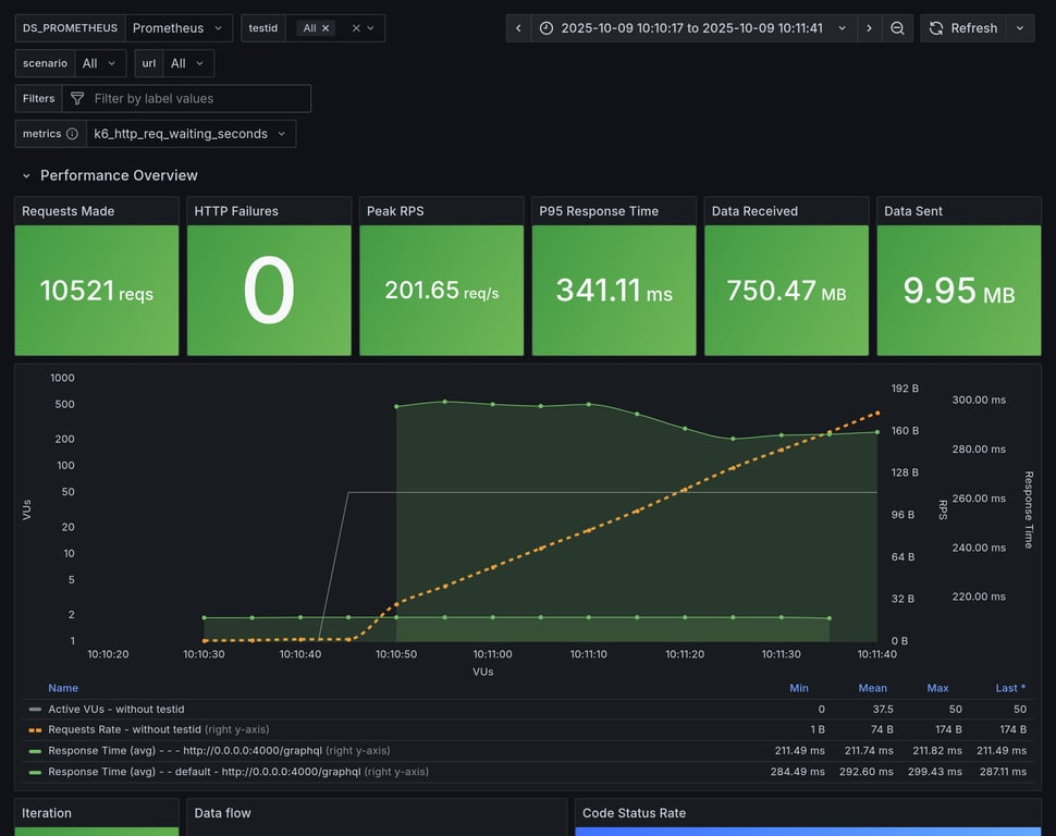 apollo-router | 394 | 26529 total, 0 failed | avg: 531ms, p95: 1224ms | ❌ 24 unexpected GraphQL errors |