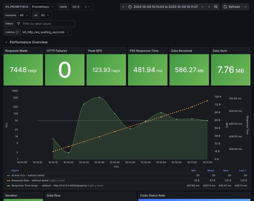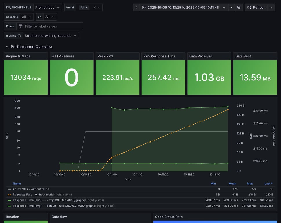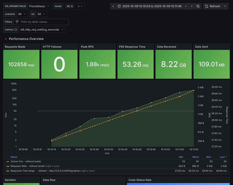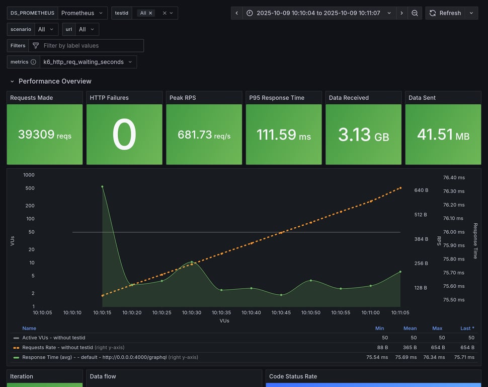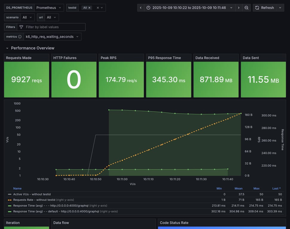 apollo-router | 394 | 26529 total, 0 failed | avg: 531ms, p95: 1224ms | ❌ 24 unexpected GraphQL errors |