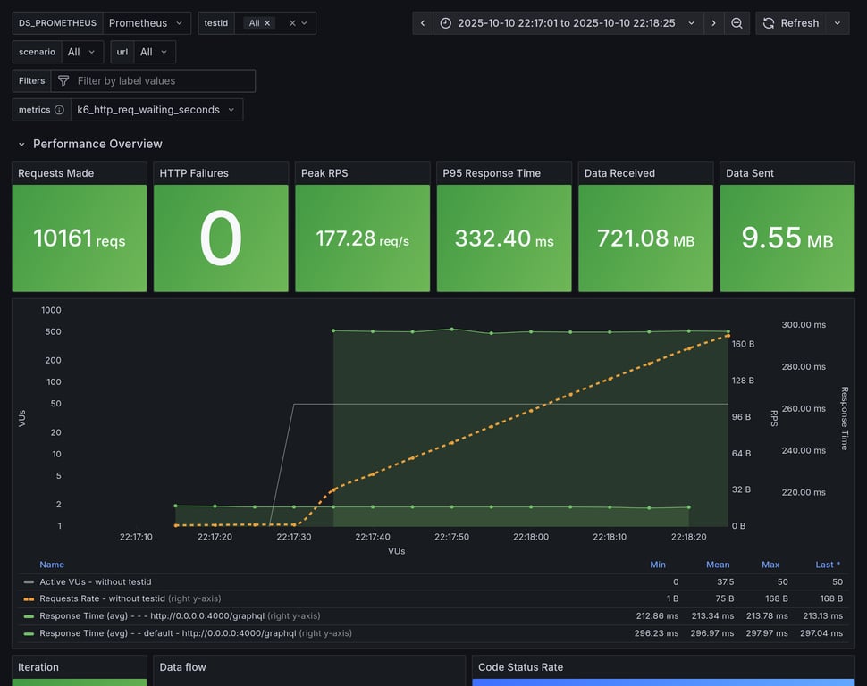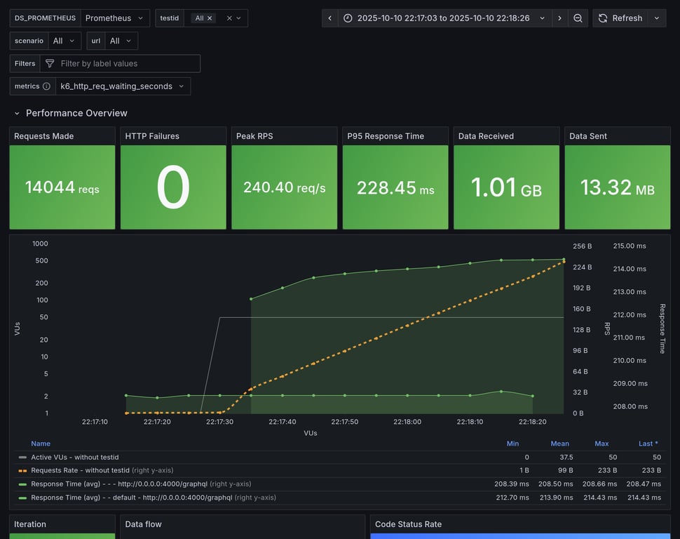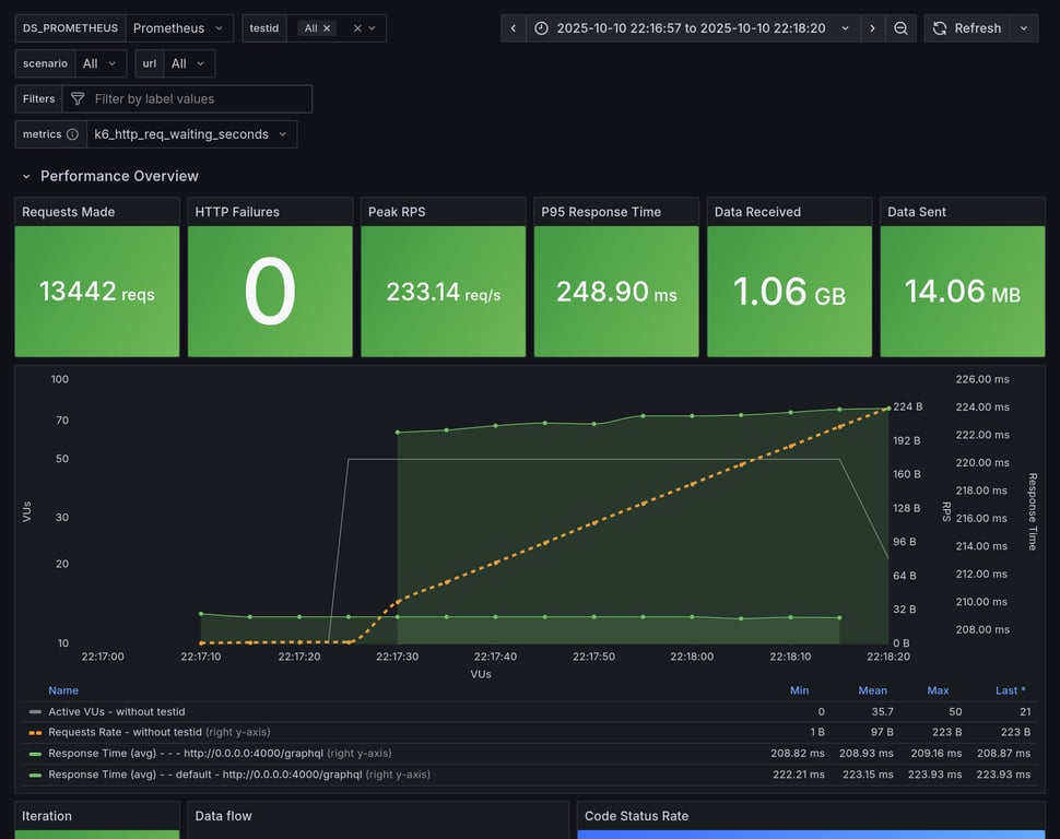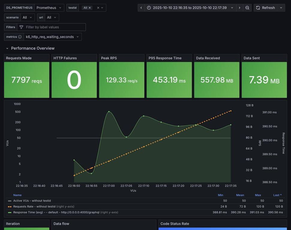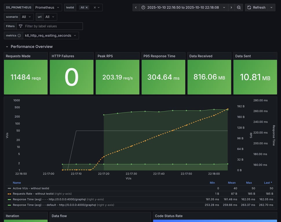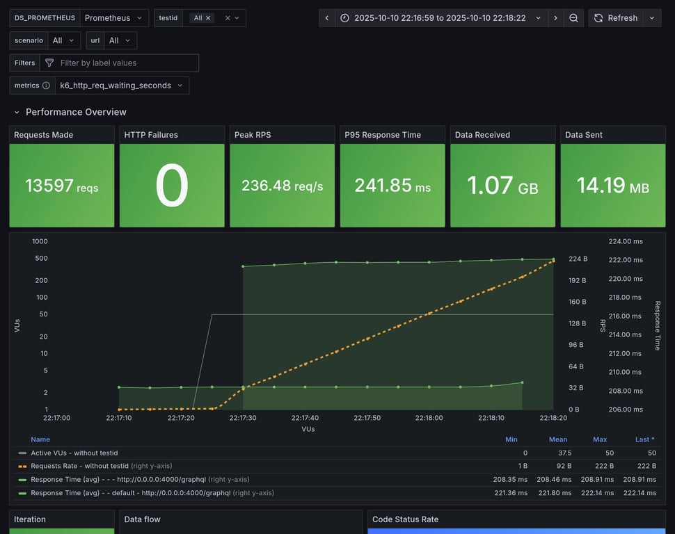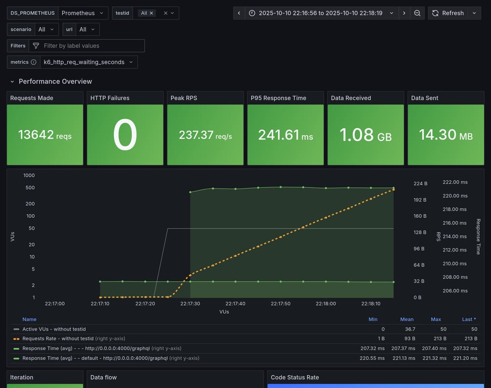 apollo-router | 388 | 26150 total, 0 failed | avg: 539ms, p95: 1216ms | ❌ 30 unexpected GraphQL errors, non-compatible response structure (1) |