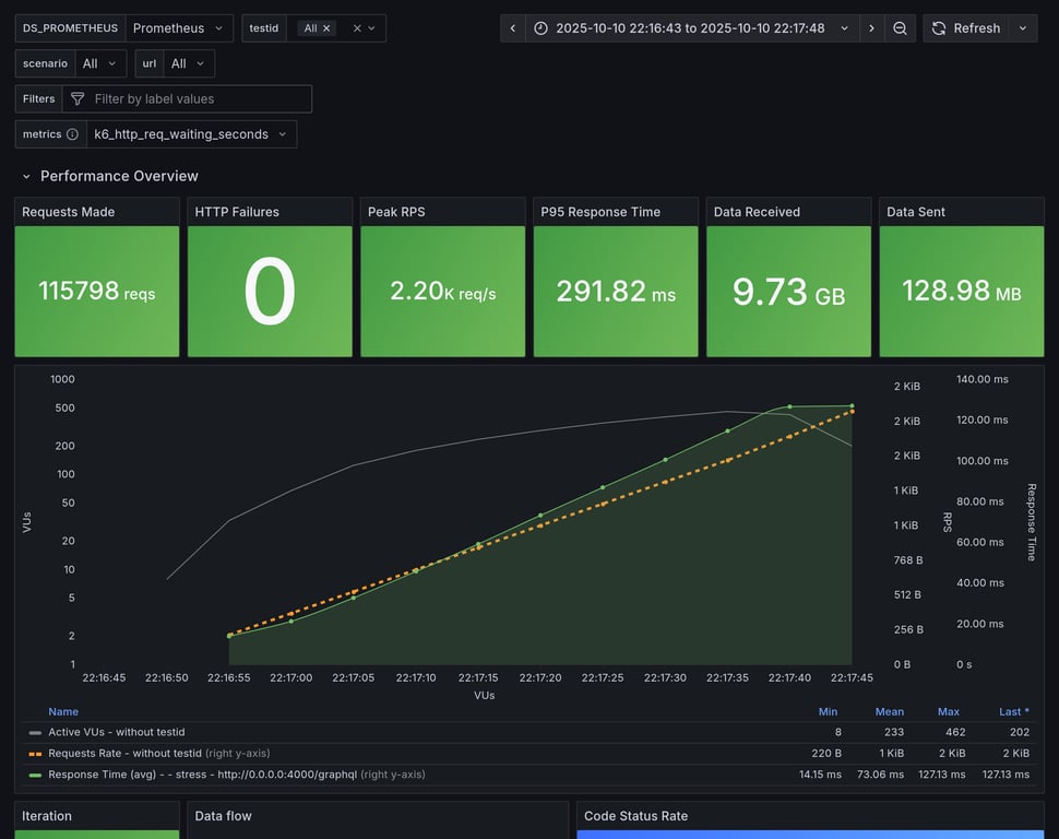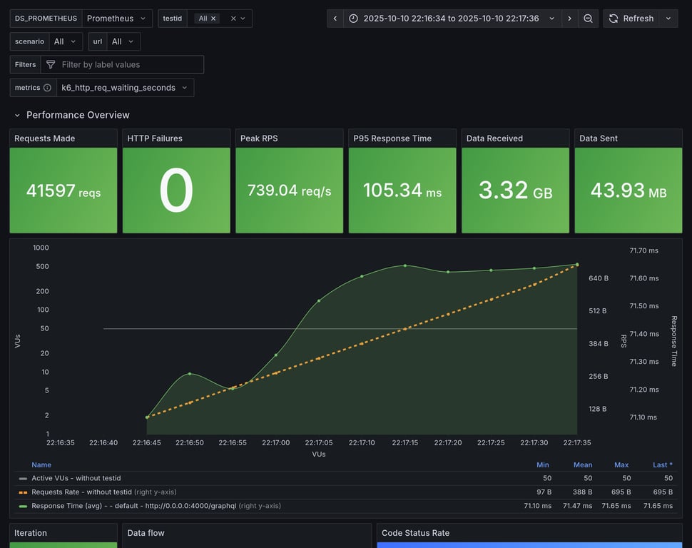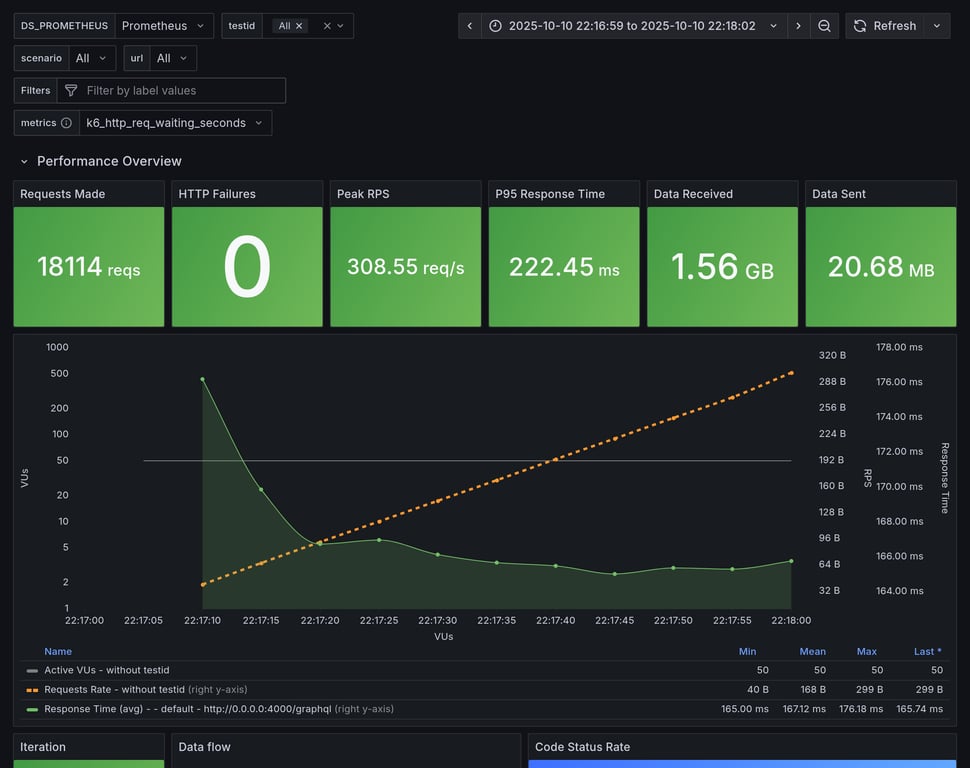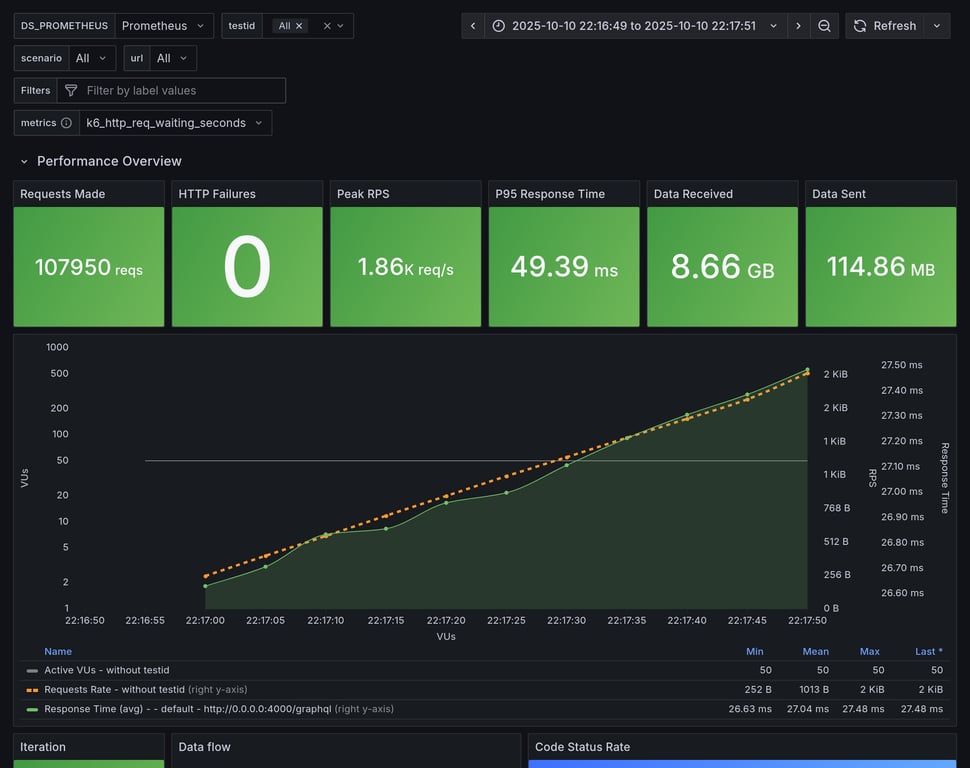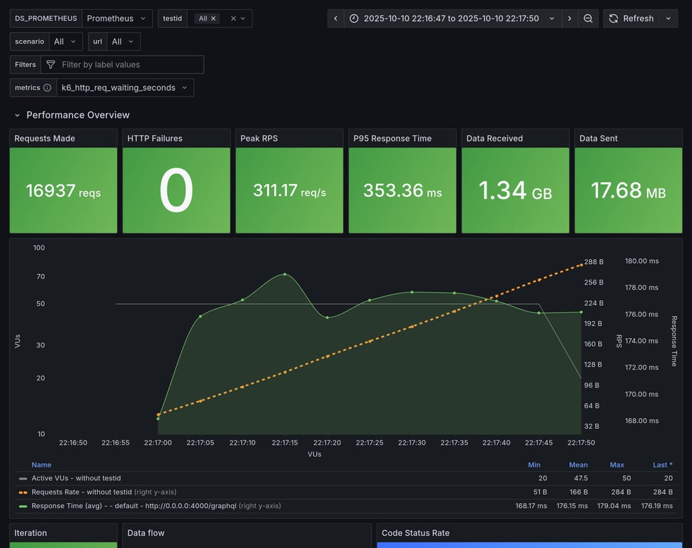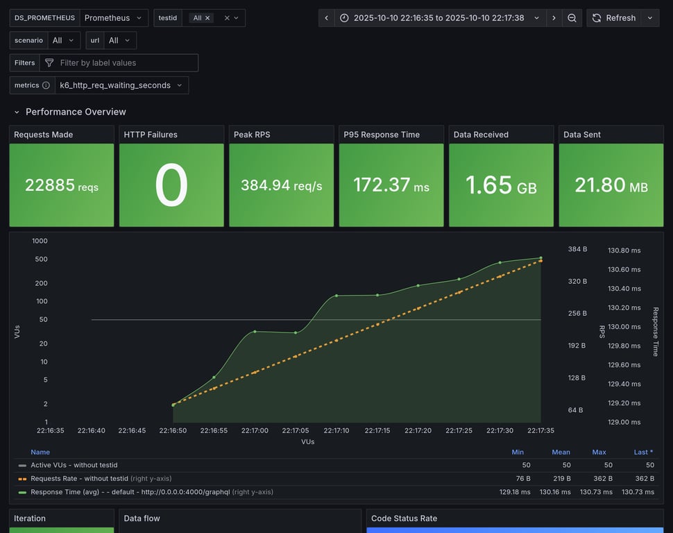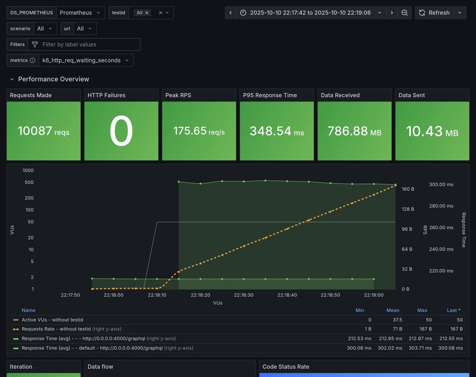 apollo-router | 388 | 26150 total, 0 failed | avg: 539ms, p95: 1216ms | ❌ 30 unexpected GraphQL errors, non-compatible response structure (1) |