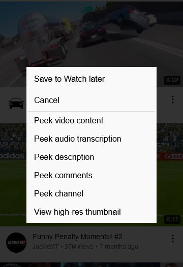Check whether it's worth watching a video before actually clicking on it, by peeking it's visual or verbal content, description, comments, viewing the thumbnail in full-size and displaying the full title. Works on both YouTube's desktop and mobile layouts, and is compatible with dark theme.