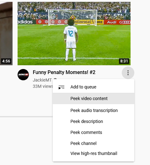 Sometimes you see a video in your recommendations with an interesting title or eye-catching thumbnail and clicks on it, just to find out the content wasn't what you were expecting or it was a clickbait. This userscript enables you to take a closer look on the video content before actually clicking on it.
