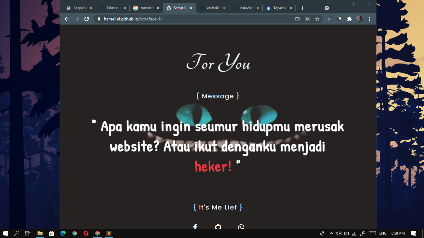 Script Deface (SC Deface) adalah alat tempur paling penting yang digunakan oleh para defacer, mayoritas sc nya berextensi { '.html' dan '.php' }. Berisi ratusan code berbahaya, sebut saja backdoor. Sekilas mirip seperti virus komputer. Defacer mencari celah suatu web, jika ditemukan nya bug/celah mereka mulai beraksi dengan sc nya dan booommm tampilan halaman depan website berubah menjadi tampilan sc mereka. Selanjutnya apalagi ?... Biasanya mereka akan pamer ke temen nya, mereka sebarkan url web yang baru saja diubah halaman depan nya ke komunitas nya dan mengatakan bahwa saya berhasil deface web contoh: { nasa.gov }. Bukan dikomunitas saja, mereka juga akan pamer ke situs web { Mirror } mereka menyebut nya { push mirror }. Saya sendiri sering mengunjungi berbagai situs mirror, saya melihat hasil mereka disitu, namun saat saya melihat sc mereka... itu semua berantakan. SC mereka dimata saya itu sangat biasa" saja :). Karena saya memiliki hobi web design, saya mencoba bikin sc deface dengan mempadukan design web yang pernah saya buat sebelumnya. Saya coba" dulu membuat dengan menyamakan sc deface mereka, yaaa tidak begitu mirip, why ? Sebab saya mempercantik dan merapihkan nya. Beda jauh sekali, yang tadinya biasa" saja sekarang menjadi luar biasa :). Apa yang akan saya lakukan ?, kebetulan banyak temen saya hobi nya deface web, saya beritahu mereka { pake sc ku kawan, para mastah mu akan minder saat kamu tebas index dengan sc yang kubuat ini :D }