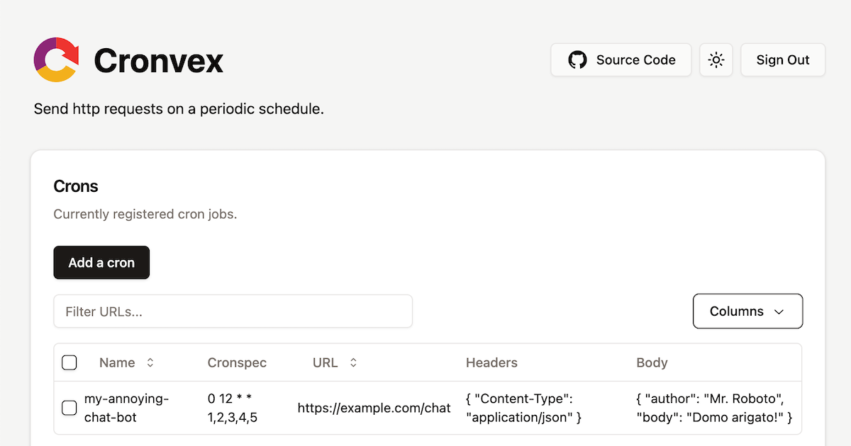 This is an implementation of a http webhook-calling cron service running on Convex. Cronvex was originally built as a demo of userspace crons before these were turned into a standalone Convex component.