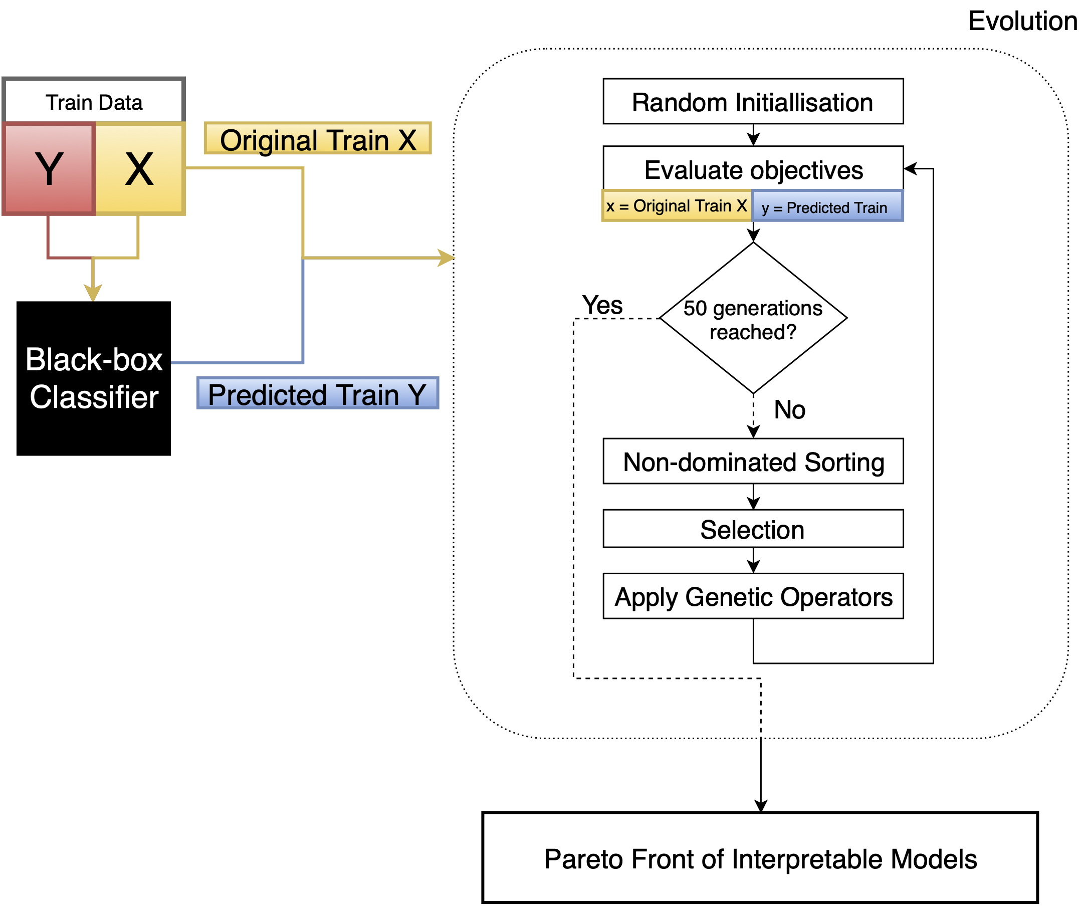 The overall training algorithm is given above. The black-box classifier is trained once only on the original data (X_train and Y_train values), then the evolutionary process is performed based on the resulting predictions (predictions) from this black-box model. The evolutionary algorithm never sees the original labels (Y_train), as this is instead attempting to recreate the predicted labels (predictions). At the end of the evolutionary run, the result is a set of Pareto optimal models/trees which approximate the complex black-box model. Only the model with the highest reconstructive ability is used here (i.e. the largest f1). The overall evolutionary process is similar to NSGAII. When selecting individuals, the non-dominated sorting in NSGA-II algorithm is used to rank the individuals.