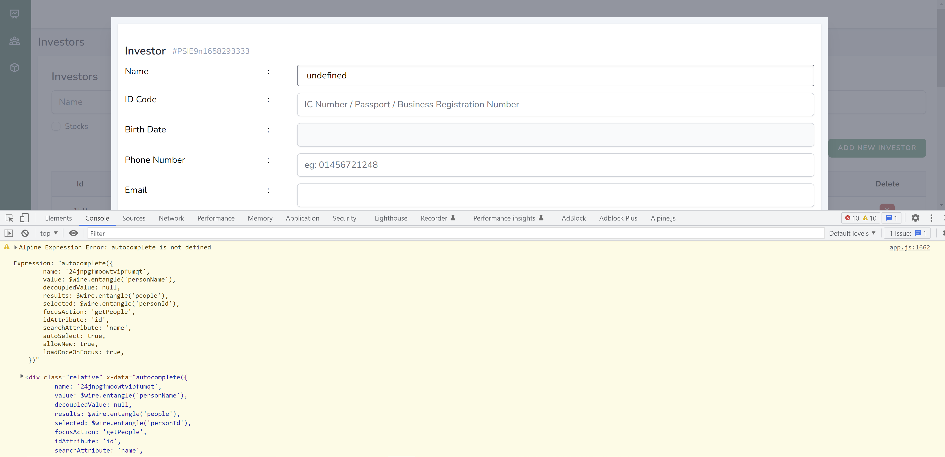 Hi Josh, Autocomplete is broken if I place the it inside the wire elements modal which is a livewire popup dialog-box component. The console warns that "Alpine Expression Error: autocomplete is not defined". But it works when it is not placed inside any modal or is dynamically created. The reason is due to autocomplete function defined in resources/views/autocomplete.blade.php was not registered into the window object when it is called by wire elements modal. A relevant post discussing that alpine not working inside the wire element modal might be having the same issue as this. I suspect the @livewire(...) blade directive used inside the wire elements modal does not register functions defined inside the components when called dynamically. The temporary solution was to assign the autocomplete function to window.autocomplete inside the autocomplete.blade.php However, I was not able to publish the autocomplete.blade.php to my views folder to do this. Any idea how can I make it work inside wire elements modal? |