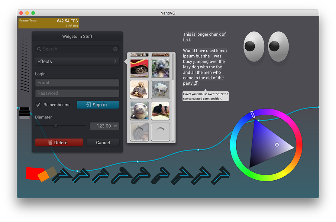 NanoVG is small antialiased vector graphics rendering library for OpenGL. It has lean API modeled after HTML5 canvas API. It is aimed to be a practical and fun toolset for building scalable user interfaces and visualizations.
