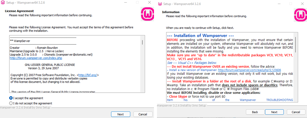 - On the next screen please carefully read the information and proceed as required, download and install the stated prerequisite software and restart the installation process a. If you don’t recognize any of the dependencies at first glance it is advised that you follow the instructions on this page closely so as to make sure that WAMP works as intended. b. If you have all the dependencies or have used a similar application to WAMP like XAMP without any issues, you can proceed by pressing next.