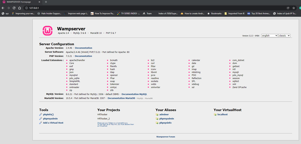 To run whichever SQL file you choose please open a browser and go to this address 127.0.0.1 which is the localhost address of your computer, if WAMP was installed properly and all the dependencies exist you should be greeted with the page below: