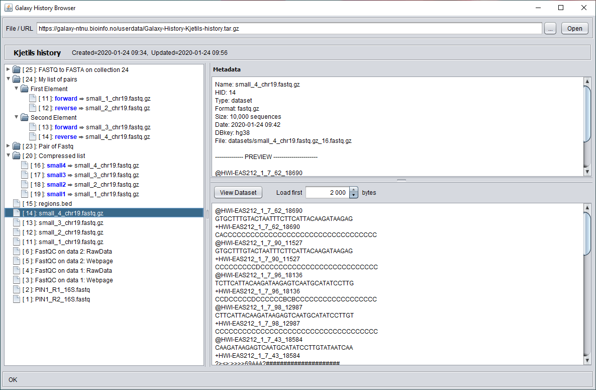 GalaxyHistoryBrowser is tool that can be used to browse histories that have been exported from Galaxy. It can load history archives (in tar.gz format) from local files or URLs, display the structure of the history with datasets and collections, show metadata for selected datasets and display previews of dataset files.