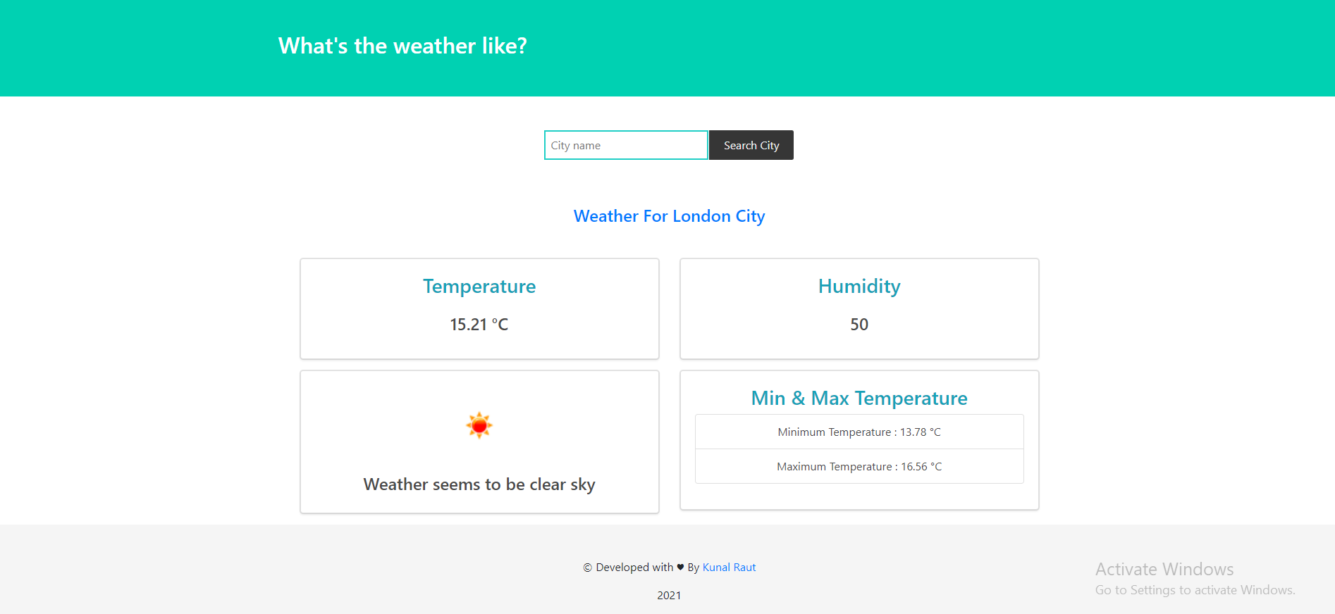 Weather_app Weather App in Django with Weather API - City Weather Application User can search Weather for Particular Cities.