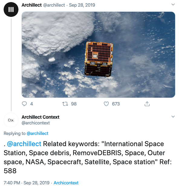 Archillect Context analyzes every image posted by @archillect and responds with keywords related to it.
