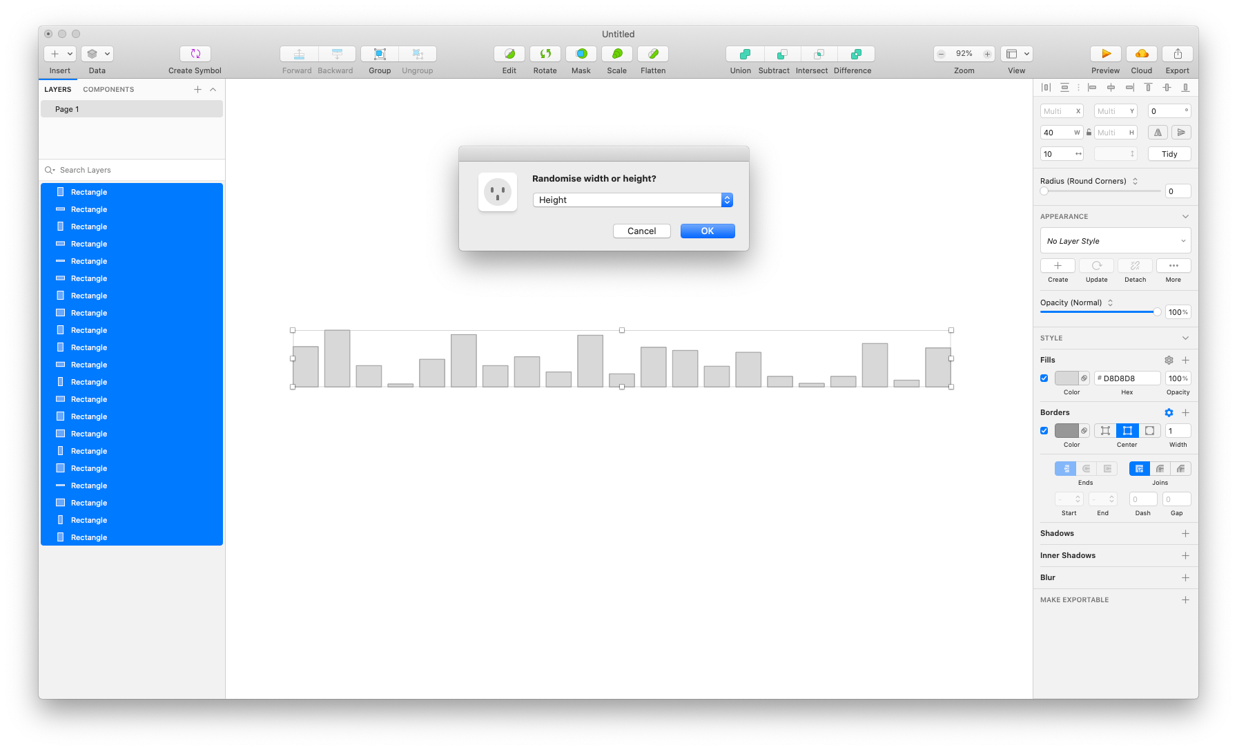A Sketch plugin that will randomly size the width or height of selected elements. In combination with other plugins like Duplicator, this is useful to simulate graphs or charts of random values.