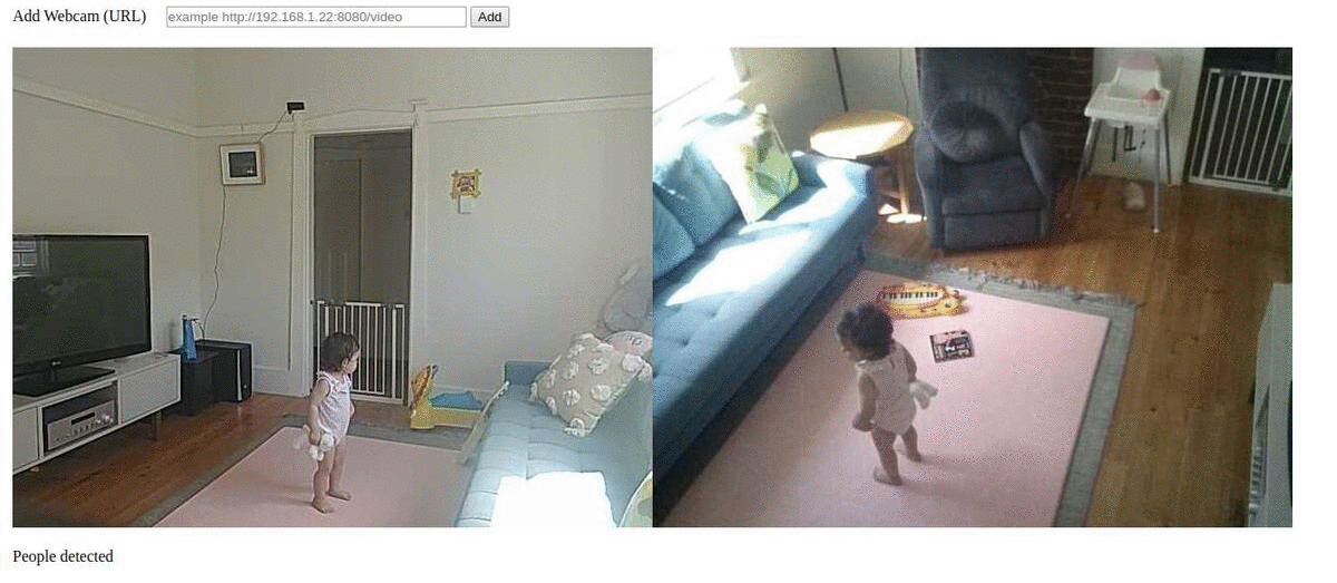 This simple site allows you to connect multiple live streams using your old phones, then utilises machine learning models (COCO SSD mobilenet & tensorflow lite) to detect the presence of people appearing in the streams. When no people are detected in all views (ie. your baby is no longer visible to any camera), the page requests your attention. There is nothing to install, just click the link below and add your cam streams.