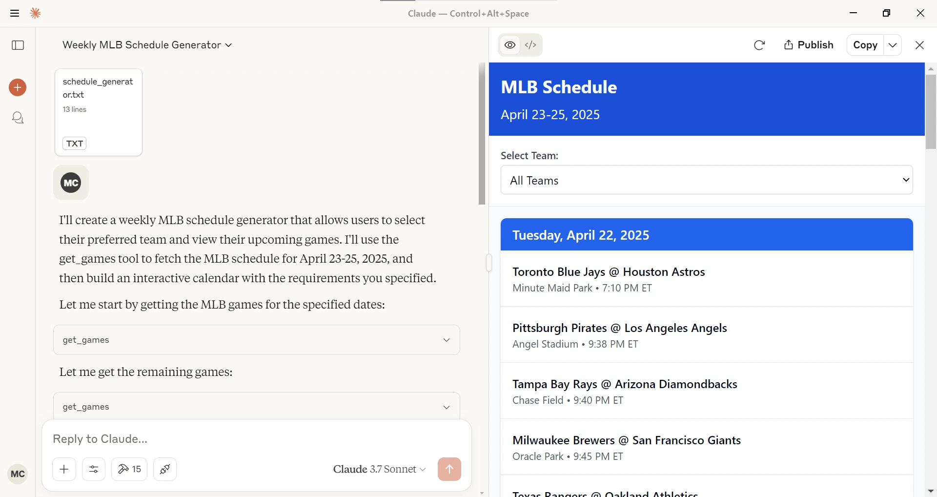 Given a league (NBA, MLB, NFL), a starting date and ending date generates an interactive schedule in Claude Desktop.