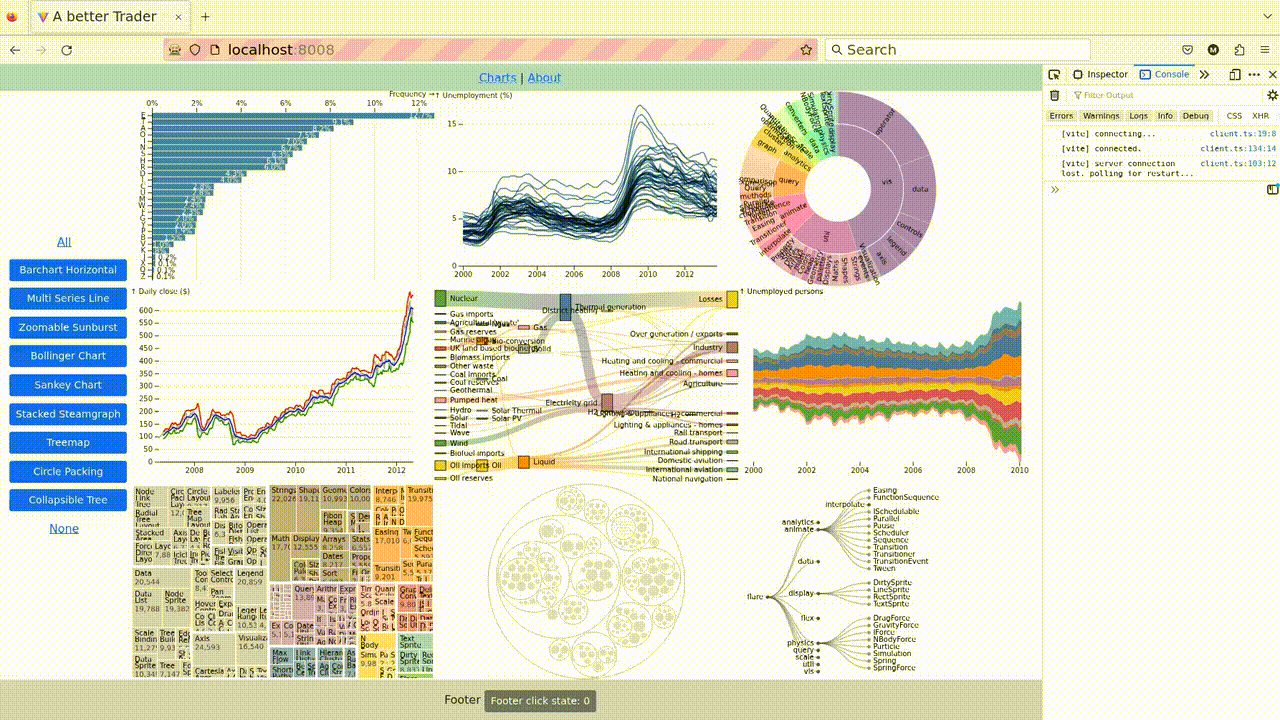 I love D3 dearly, and that love came from browsing Mike Bostock's fantastic examples. They have mostly been migrated to "Observable notebooks", which are great to teach and provide context. But I'm a time-constrained dev and I needed a framework where I could quickly paste the example code and play with it live. A framework that would also be a decent "Hello World" basis for starting a fuller single-page app. That's the purpose of this skeleton.