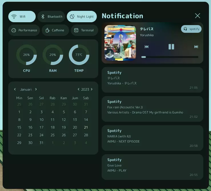 - Music Player : mpd + ncmpcpp, spotify