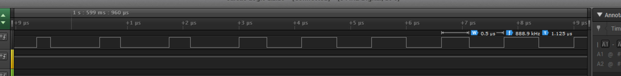 ^It would be nice if neopixelWrite would also take an Uint8ClampedArray or Uint8Array. Posted at 2015-11-23 by MarkusGritsch I further tried the example as is (just replaced SPI2 by SPI1), and it roughly works (neglecting the first-byte delay problem), but it runs VERY slow: The LEDs are updated only every 120 ms. Calling require("ESP8266").logDebug(false); improved it a bit but still 108 ms. Is it really supposed to run that slow? Posted at 2015-12-01 by bluebie I don't think this is a good solution for Espruino, but this I2S DMA WS2812 driver is really neat: https://github.com/cnlohr/esp8266ws2812i2s Posted at 2016-01-11 by jnewcomb Tip: My ESP-7 defaults to 160MHz when newly flashed - which runs neopixelWrite(..) at twice speed fixed it.. Posted at 2016-01-11 by DrAzzy Yeah, current builds default to 160mhz, which offers significantly better performance. It looks like the neopixel code needs to be updated to work at 160. Posted at 2016-01-12 by tve Ugh, I did forget to update the neopixel code! Apologies. I knew I was forgetting something but couldn't put my finger on it. Please run at 80Mhz in the meantime. Posted at 2016-02-22 by creationix I've got a ton of different neopixels from Adafruit for testing (including the new GRBW variants). I can get them to work on my ESP8266 as long as I knock the CPU freq down to 80Mhz. As I helped with neopixel support on nodemcu and am adding support on my own platform for esp8266, I can help with updating the code here if someone would direct me to the right place. Also a suggestion. I bought one real espruino board (the pico) and using the SPI method I can mix GRB neopixels and GRBW neopixels just fine on the same pin. I just need need proper byte offsets in my logic. But using the esp.neopixelWrite command, I'm restricted to multiples of 3 bytes which is wrong once the 4-bytes-per-pixel GRBW hardware is introduced. We should remove that constraint. Posted at 2016-02-22 by creationix Also I just noticed that the Posted at 2016-02-22 by @MaBecker don't miss this nice and cheap ones Posted at 2016-02-22 by JumJum One more option (even cheaper and delivery from GreatBritain) could be this: Posted at 2016-02-22 by @MaBecker I definitely have to check more sides in the UK - thanks ! Posted at 2016-02-22 by DrAzzy Why are we discussing neopixel hardware here? Shouldn't we be more concerned with the bugs reported by @creationix ? What version of the Espruino-for-ESP8266 firmware are you using? As noted above, this problem was known - but I thought it was fixed! Posted at 2016-02-23 by tve @creationix which firmware version are you using? espruino_1v84.tve_master_f35ac96_esp8266.tgz is supposed to work with both cpu freq's. I tested both, but of course I may not have been thorough enough or not all neopixels are created equal... Posted at 2016-02-23 by @gfwilliams @tve for the saving, I guess it's not such a big deal - but in jsiDumpState (iirc?) it can create an init string that is executed before Posted at 2016-02-25 by tve yup, that makes sense. it's also not that difficult to set the clock freq in the onInit()... Posted at 2016-04-20 by creationix I'm trying again today. I've got what I think is the latest firmware (espruino_1v85.tve_master_66fde09_esp8266) flashed onto my brand new Wio Link (esp-12-ish). The repl works great over serial (much nicer than nodemcu's raw repl). The wio link deluxe kit comes with a neopixel strip. It works great using their provided software (HTTP based interface), now I'm trying the same hardware using espruino. No matter what I do, the pixels don't light up. Posted at 2016-04-20 by creationix Hmm, not sure what's up. When I use my full program it does work. See for comparison. Posted at 2016-04-21 by tve Looks to me like your full program uses a UInt8Array and your short test doesn't... Posted at 2016-04-21 by @MaBecker @creationix your code is working on my ESP8266 with 1v85.tve_master_cee7141 can you try a different pin ? Posted at 2016-09-16 by Kolban Has anyone gotten the NeoPixels function working recently. When I try and run it, the first neopixelWrite() works but ones after that seem to be ignored. This is the sample I am using: Posted at 2016-09-16 by JumJum I have the neopixelWrite working (most of the time) Posted at 2016-09-18 by Kolban I still can't get the latest builds to run my ws2812b Neopixels ... so I got out my signal viewer which is super high resolution and started looking at the signals. In my tests, I have just one Neopixel connected (again ... just for testing) and every second, change its color from red to green. This should be the byte sequence 0xff 0x00 0x00 (red) and then a second later 0x00 0xff 0x00 (green). The way that bits are sent to a Neopixel is that a "1" bit is high for longer than a "0" bit. This page gives a good reference ... https://cpldcpu.wordpress.com/2014/01/14/light_ws2812-library-v2-0-part-i-understanding-the-ws2812/ The summary is that a "1" bit should be high for >= 625ns and a "0" bit should be high for less than 563ns. My logic trace shows that we are all over the place. See the attached diagrams: What I am seeing is that the "relative" durations of highs vs lows is working but the absolute values are out of whack. @jumjum ... I'm really interested to hear what you have and have not got working. What kind of NeoPixels are you using? Do you known if they are WS2812s or WS2812b's or something else? Attachments: Posted at 2016-09-18 by JumJum @Kolban, take a look to this Posted at 2016-09-18 by Kolban In an attempt to provide more information, I created a 70 second you tube video ... see here: https://www.youtube.com/watch?v=z8TJu-3PxqA The Script I am using is as follows: which alternates a string of 20 pixels between red, green and blue once a second. The Espruino build is the downloadable binaries for 1v87. The ESP8266 is a NodeMCU DevKit module. When I started capturing the video, all was working as expected. At about the 20 second mark, we can start to see the weir