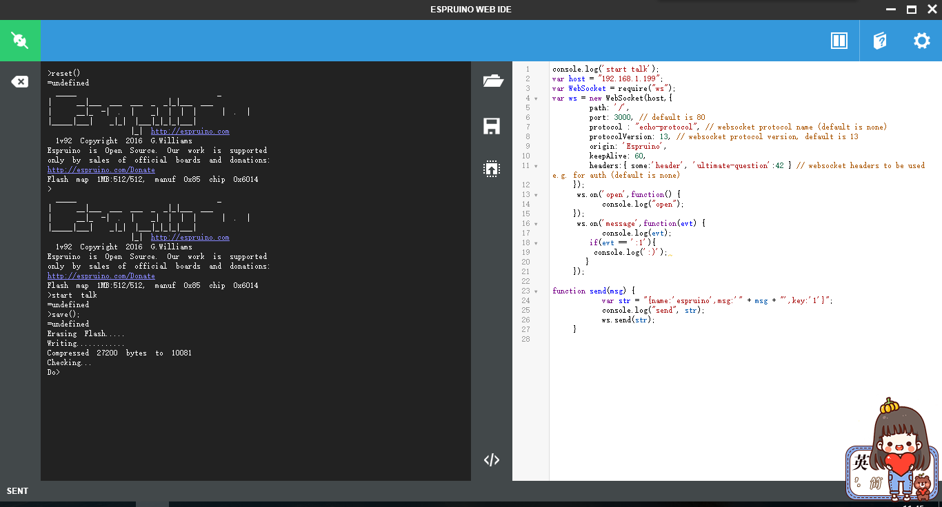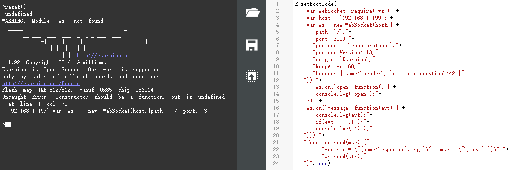 Posted at 2017-11-28 by Jessie if use E.setBootCode('...'); then show module 'ws' not found. Attachments: Posted at 2017-11-28 by Polypod What do you mean no reaction ? Does your board freeze and become unresponsive to any command? Posted at 2017-11-28 by Jessie Thank you very much. Posted at 2017-11-28 by @allObjects