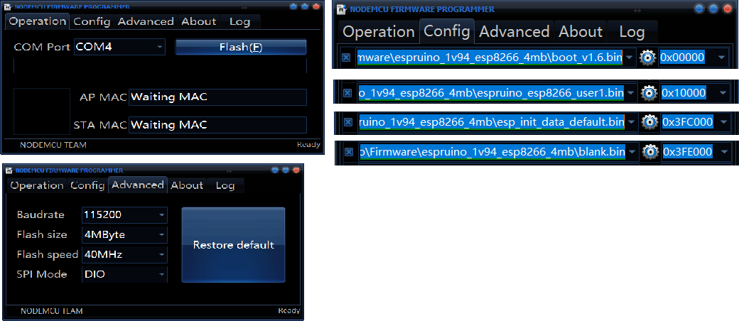 Trying to load the latest Espruino firmware 1.94 to my ESP8266 12E boards. It came with Node MCU and I used it to flash Arduino programs through it's IDE and it worked perfectly.