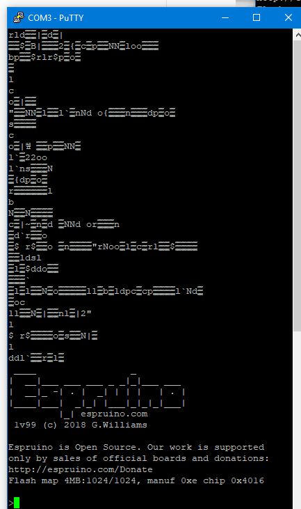 From putty I am trying to connect to the board directly with 115200 baud and then I power cycle it and try again. After that I attempt the Espruino Web IDE with 115200 baud. I have also tried this esptool.py line: