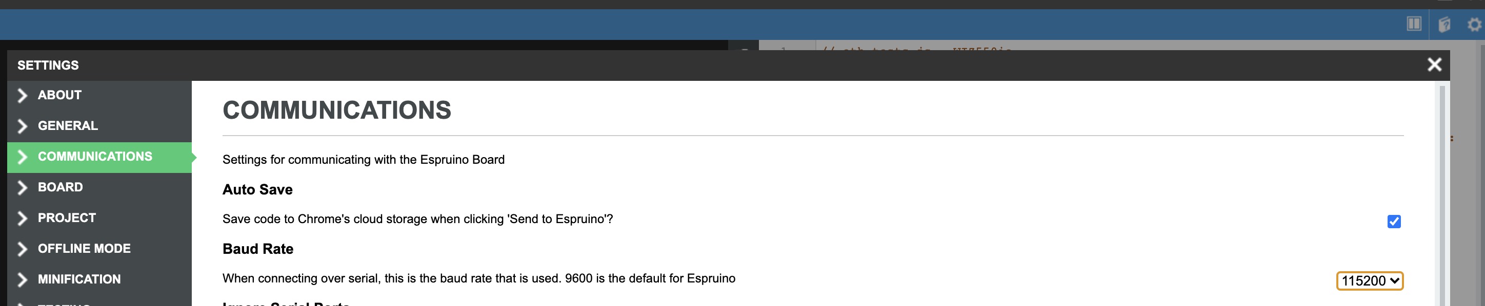 DO NOT RESET OR DISCONNECT IT BEFORE THE NEXT STEPS In Espruino Web IDE make sure baut is set to 115200 Connected to the COM port of the device, it complains, just press connection button in the IDE to dis- and reconnect.