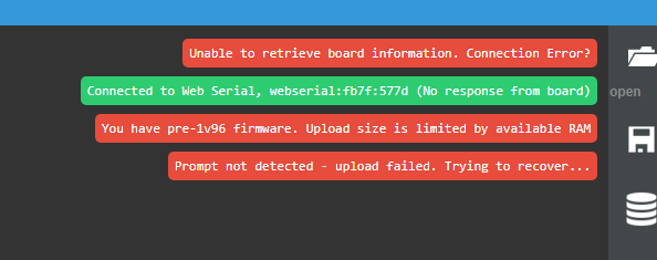 Posted at 2022-04-19 by @fanoush try resetting via button while connected like this, do you see any (maybe garbage) output in espruino console? try changing baudrate to 125200 in espruino IDE settings and reset board again |