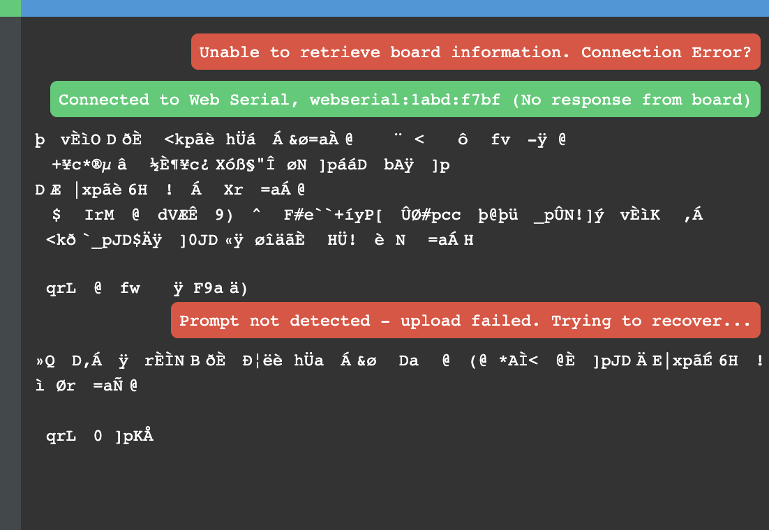 Posted at 2022-05-28 by @MaBecker make sure to set WebIDE baud rate to 115200 Posted at 2022-05-28 by user144453 Its works! Thanks! |