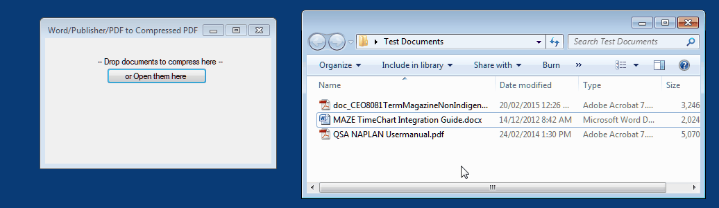 Simply drag some PDF or Word or Publisher files you'd like compressed to PDF and it will spit out compressed versions in the same directory as the originals. See below: