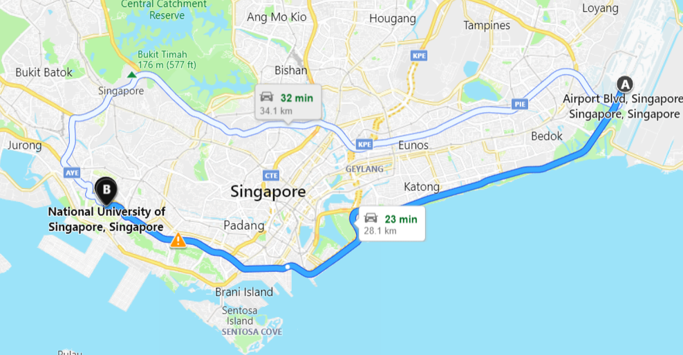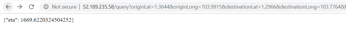 Access the endpoint at: http://52.189.235.58/query?originLat=1.3644&originLong=103.9915&destinationLat=1.2966&destinationLong=103.7764&hour=1&weekday=1