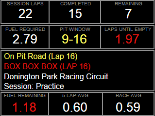 Note: The calculations for required fuel automatically includes an extra half of a lap to ensure you can cross the finish line. The half lap fuel addition is calculated using half of the current 5 lap average fuel burn rate and is automatically included in the required fuel figure.