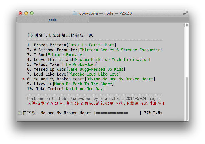 npm installthen run luoo-down by commandnode app - Select the music you want to download then press ENTER.