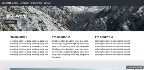 Bootstrap is a component library, which is an awesome tool because it performs a lot of styling work for you. Instead of having to build components like full-screen background images and image carousels using all kinds of nested divs and spans, Bootstrap does the work for you in pre-set classes! Some useful classes to know about include: