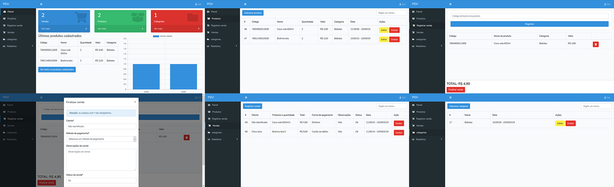 Sistema de controle de vendas para lojas, com cadastro de categorias, cadastro de produtos e relatório de vendas.