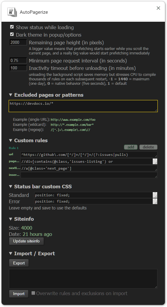 });wedata.net- used to update the database of pagination rules from http://wedata.net/databases/AutoPagerize/items_all.json which is stripped of everything except XPath selectors for the page elements and RegExp for the page URL<all_urls>- required to paginate while you browse according to the database of rules (technically, to find the "next page" and "page body" elements)alarms- to schedule a database updatecontextMenus- to add an "On/off" item to the context menu of the extension icon in the browser toolbaroffscreen- ManifestV3 way of handling DOM/XHR in the background scriptscripting- to run the pagination script in the matching tabsstorage- to store the options of the extensiontabs- most notably to restart the paging functionality on extension update, also to notify the tabs that match the URL that you've just manually excluded in the popupwebNavigation- to schedule a pagination check when you navigate to a new URL