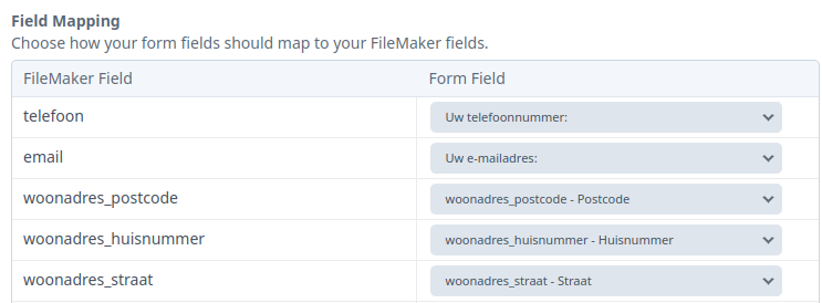 😄 This is a Filemaker connection and in FIlemaker you create a layout per form. So you can map your website form to the Filemaker form.
