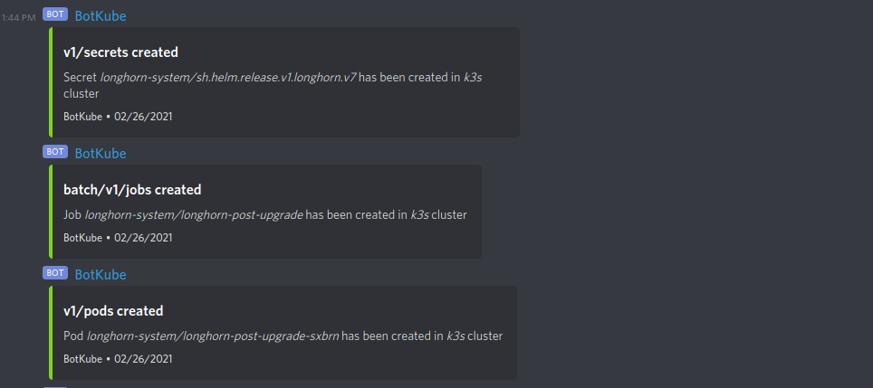 botkube provides richer integration with multiple chat clients for alerts and cluster management if desired. This configuration is using discord for the alerting.