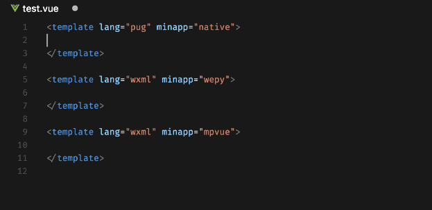 表示使用 wxml 语言,不使用任何框架<template lang="pug" minapp="mpvue">