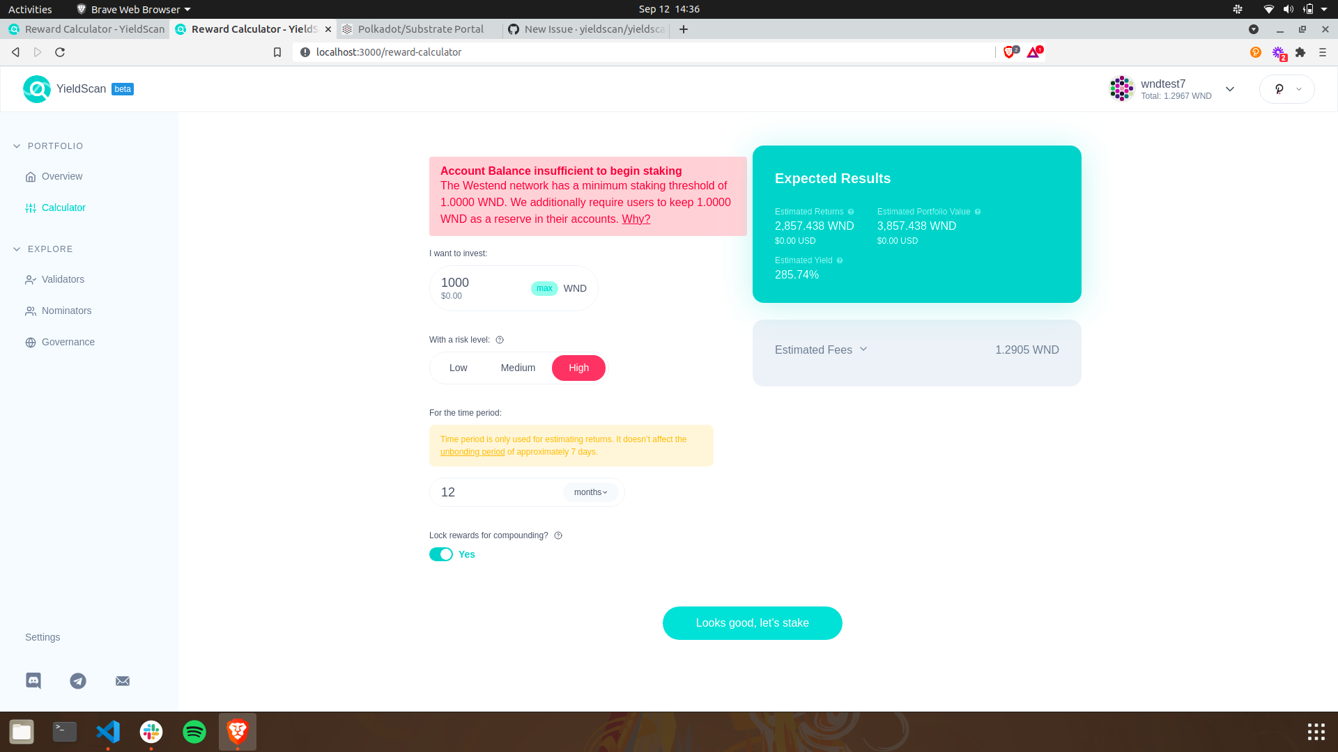 On the reward calculator page, the default input amount shown for an account with non-zero available balance is 1000 WND. Clicking the max button makes it 0.