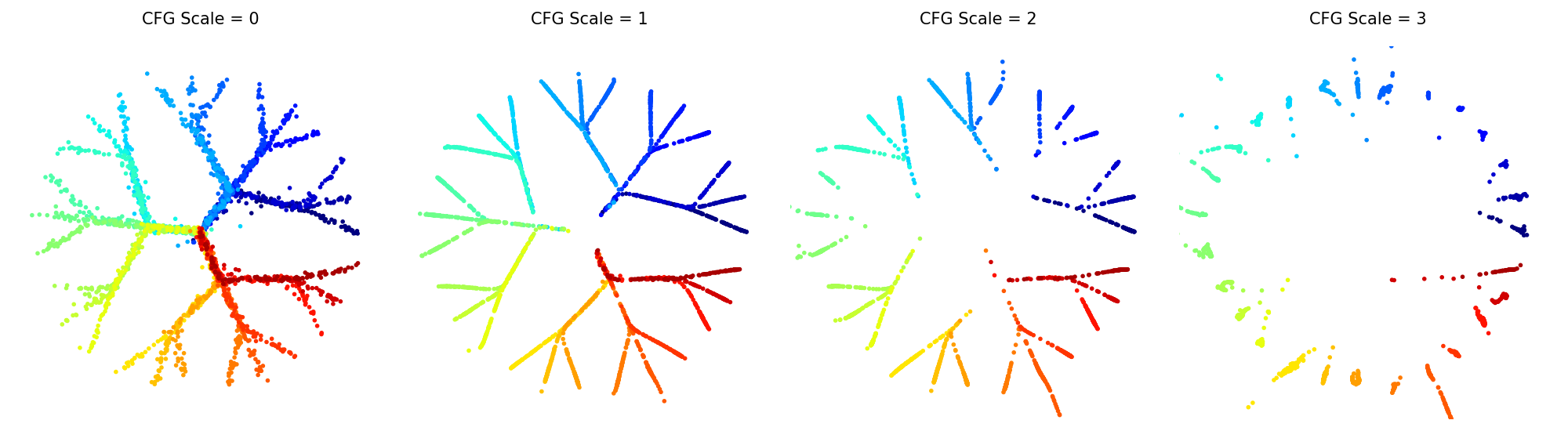 We can also train conditional diffusion models and sample from them using classifier-free guidance. In examples/cond_tree_model.ipynb, samples from each class in the 2D tree dataset are represented with a different color.