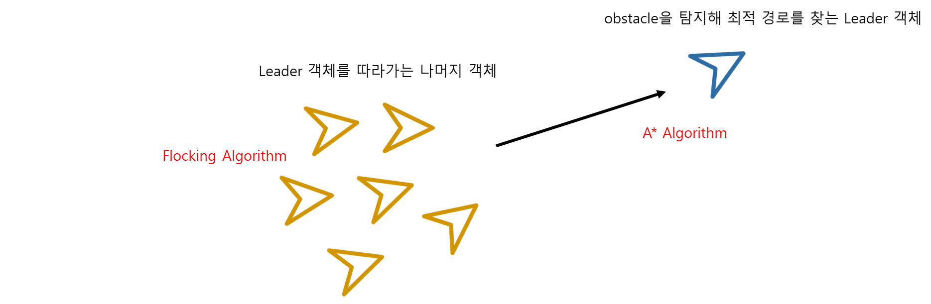 각 벡터에 가해지는 중량을 다르게 해 Leader를 향한 벡터의 힘을 가장 크게, flocking 알고리즘을 구성하는 세 가지의 법칙 중 cohesion과 separation의 가중치는 비교적 낮게 설정하여 Leader를 따르면서도 서로 부딪히지 않는 군집의 모양을 만들어낸다.