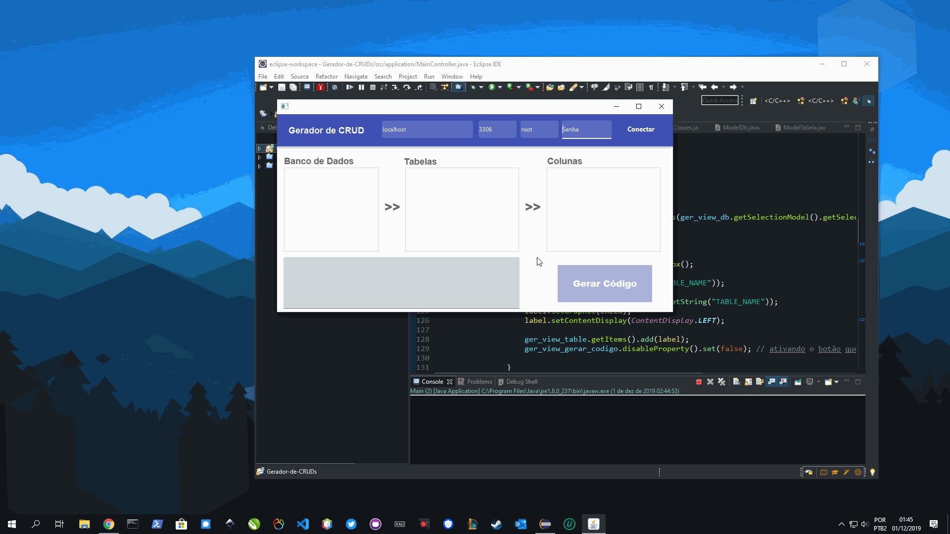 Gerador de CRUDs em JAVAFX Trabalho de Paradigmas de Programação com o objetivo de gerar código automático a parti de metadados de tabelas SQL O software em java, deve: Gerar um aquivo DAO Gerar um aquivo com a classe que representa a tabela Gerar um aquivo de exemplo IDE usada Eclipse 2019-06 Bibliotecas usadas JFoenix para o java 8 mysql-connector-java-5.1.48 OBS: Por se tratar de uma atividade, não tenho interece na continuação do projeto, ficando para quem tiver a curiosidade da implementação