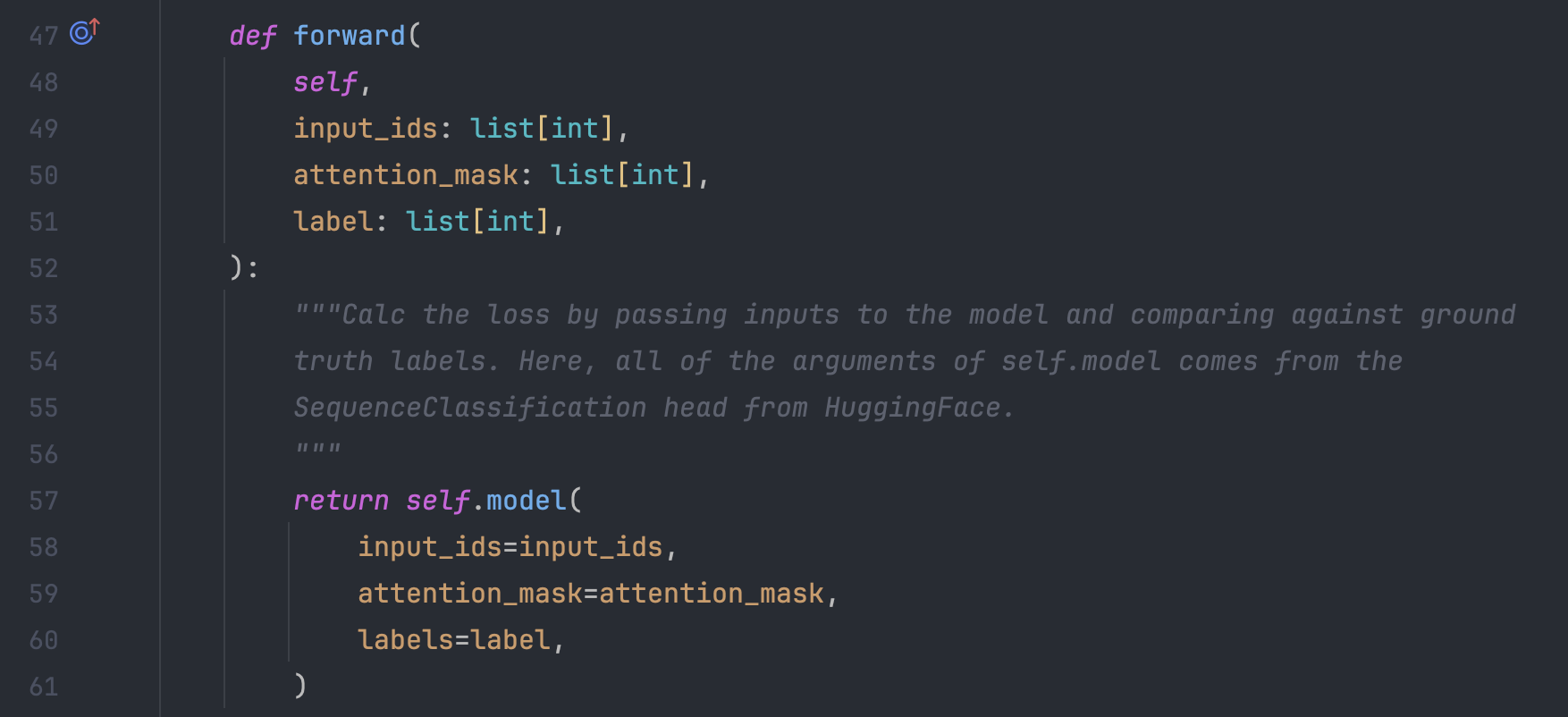 forward are: input_ids, attention_mask, and label. These are the outputs of a