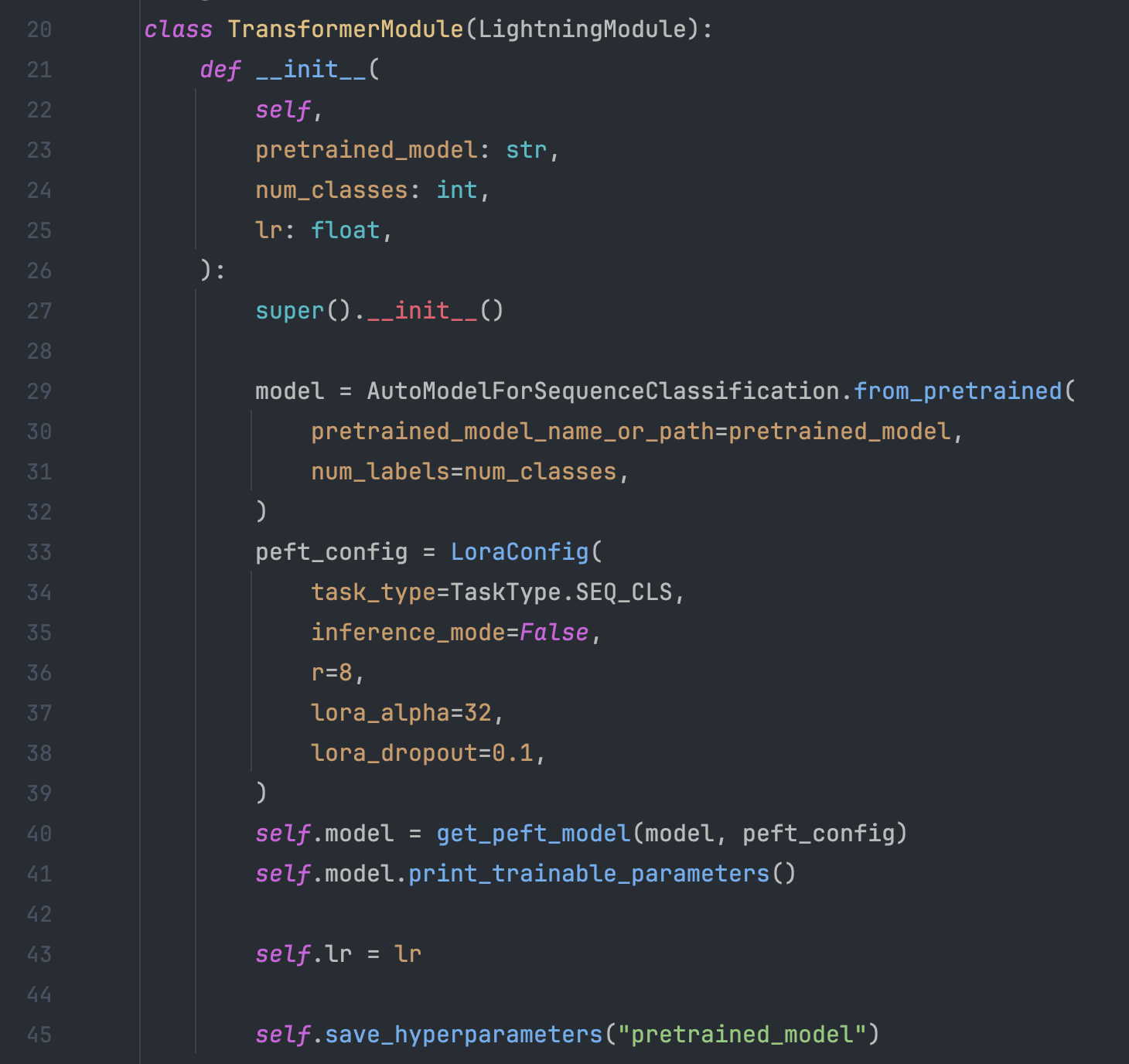 What's really crucial here is that the constructor loads a pretrained model from Hugging Face, and sets up Parameter Efficient Fine Tuning (PEFT). PEFT is the bleeding edge way to fine tune Large Language Models, and is a Hugging Face implementation of QLoRA, which is the combination of three different efficiency strategies: quantization, low rank, and adapter. Quantization is the idea that a single-byte integer is of sufficient numerical precision for gradient computations in deep learning. Low rank comes from the linear algebra concept that the rank of a matrix is the number of non-redundant dimensions of the vector space. Adapter tuning can be understood as a sort of generalization of tuning the head of the network, by refitting a portion of the weights in many layers.