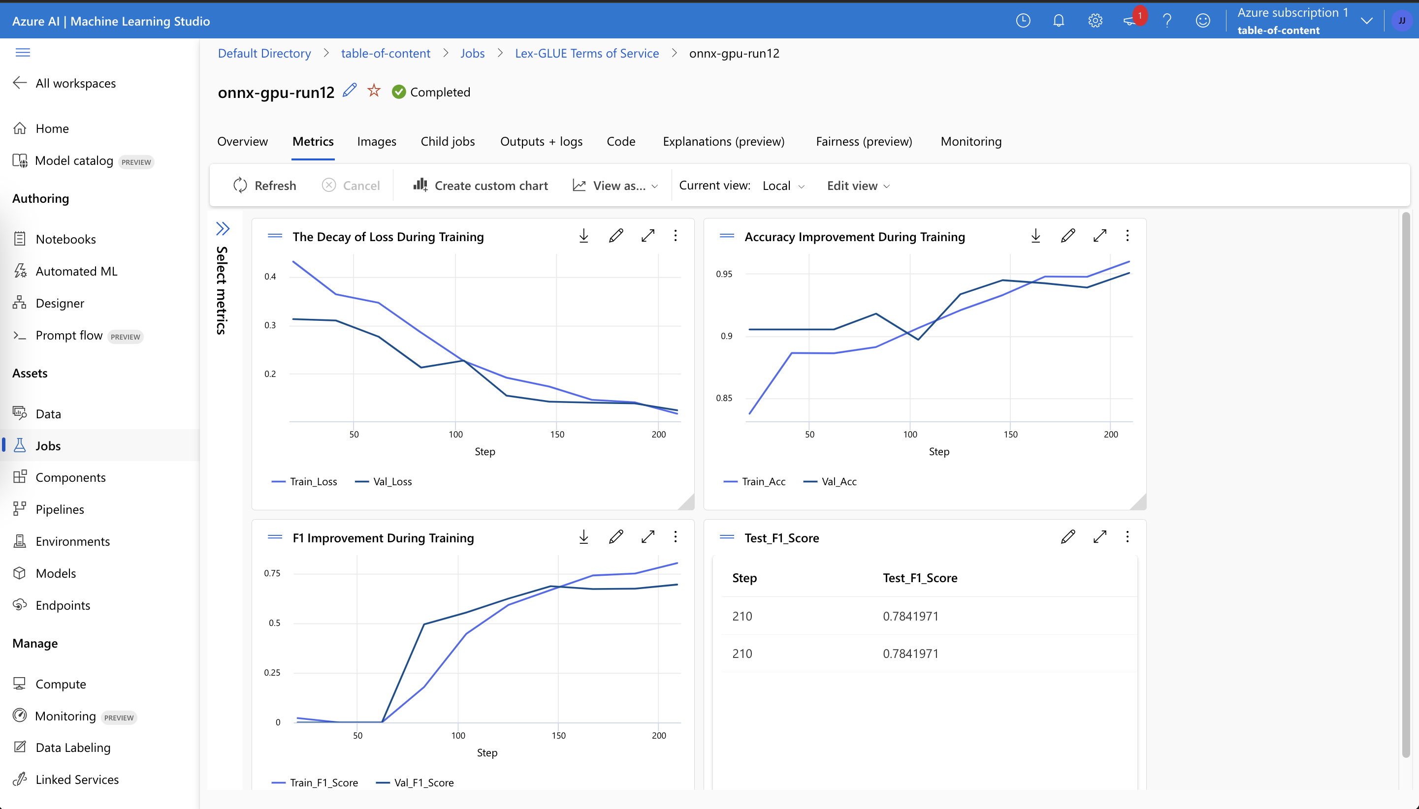 Taking advantage of the tight integration between Azure and MLflow, the metrics from our training run have been made available for easy consumption and visualization in the Azure ML web console. MLflow captured way more than just the metrics, but going deeper into its full functionality and the broader use cases of MLOps is for another day. For now, let's focus on the story that our data visualization reveals to us.