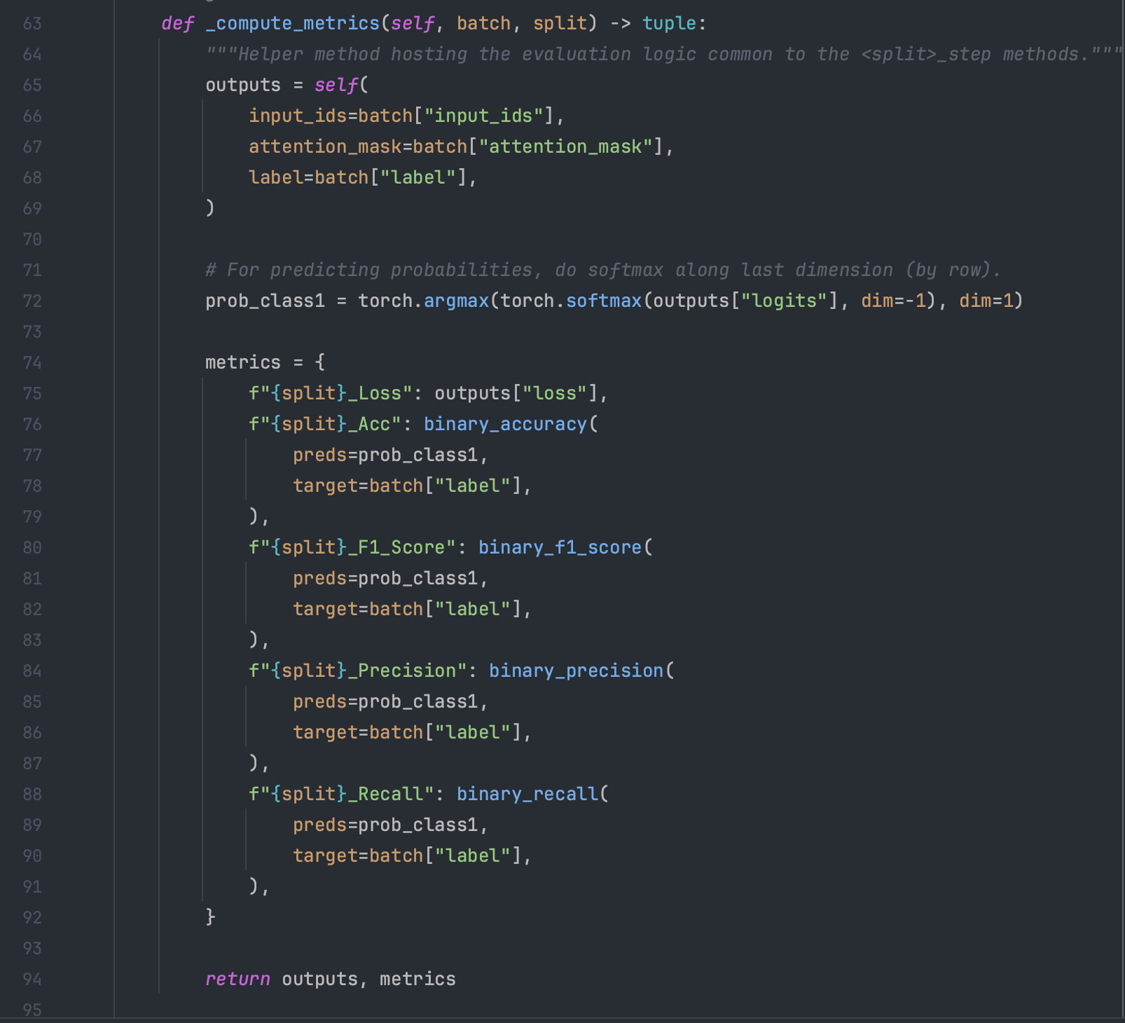 actual (batch["label"]) to calculate the accuracy, F1, precision, and recall.